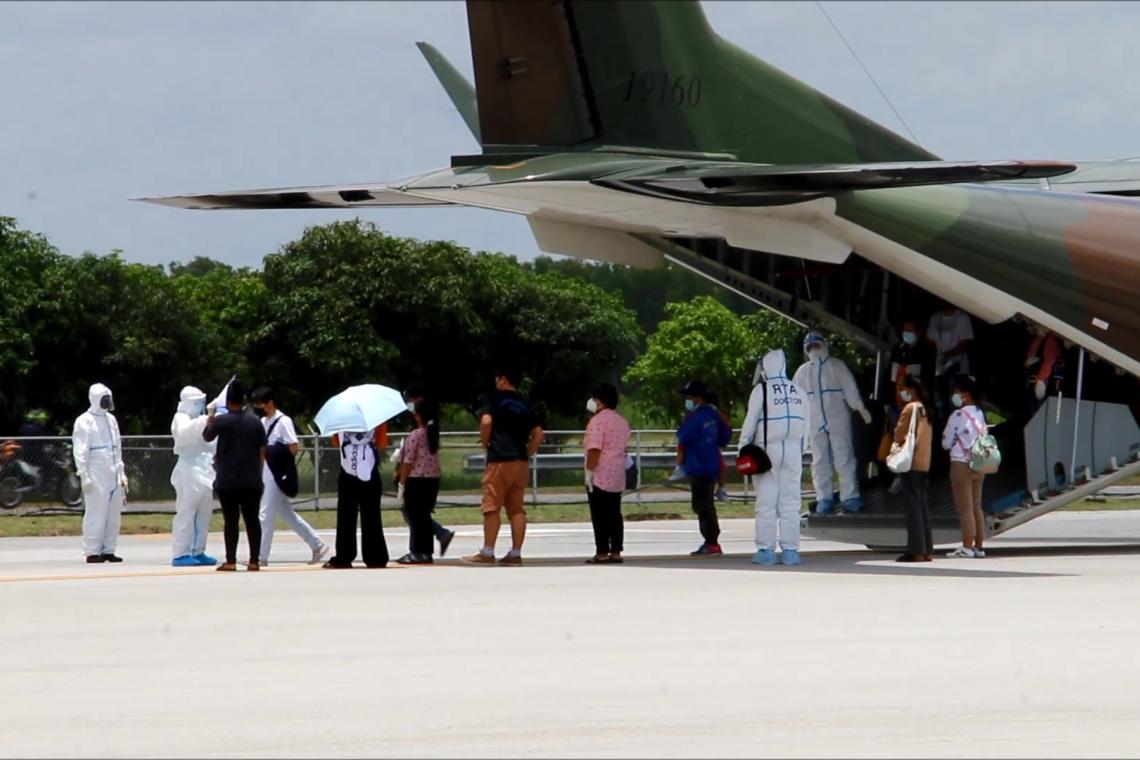 At the landing area in front of the Wing Command 23 Udon Thani, Mr. Siam Sirimongkol, Governor of Udon Thani Province, Mr. Nitipat Leelalert, Deputy Governor of Udon Thani Province, Mr. Noppadon Mamark, Permanent Secretary of Udon Thani Province. Lt. Col. Surasak Sesavej, Commander of the 23rd Airborne Division, Col. Thanavie Wichachai, Deputy Commander in Chief of Royal Thai Army, 24, directing the reception of 23 Udon Thani patients with COVID-19, which the Royal Thai Army Arrange a transport plane or bor. Lor. 295 from Bangkok back to domicile and come to live in Udon Thani province. Separated into 6 patients from Bangkok, 8 Samut Prakan, 1 Samut Sakhon, 4 Ayutthaya, 1 Nakhon Pathom, 2 Rayong and 1 Pathum Thani patients, with an ambulance waiting to pick up the patient to be examined at a special hospital ward or hospitel number 7. Kan from Udon Thani Hospital Prajak Silpakom Camp Hospital Wing 23 Hospital, Bangkok Hospital Udon Aek Udon Hospital and Wattana Hospital At the same time, there is a team of doctors and nurses if there is an emergency ready to act immediately.