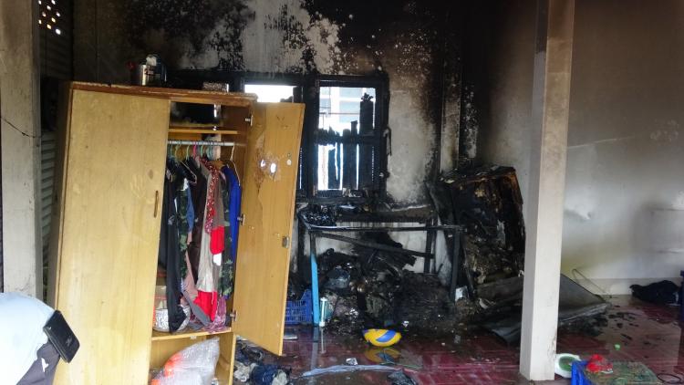 เมื่อเจ้าหน้าที่มาถึงบ้านที่เกิดเหตุ เป็นบ้านปูนชั้นเดียว ไม่มีเลขที่ เจ้าของบ้านและเพื่อนบ้านกำลังช่วยกับดับไฟเป็นที่เรียบร้อยแล้ว และกำลังช่วยกันขนสิ่งของที่ได้รับความเสียหาย และเปียกน้ำออกจากบ้าน จุดที่ถูกไฟไหม้เป็นมุมห้องโถงที่มีการเก็บสิ่งของรวมกันไว้ ซึ่งส่วนใหญ่เป็นเสื้อผ้า ผ้าห่ม ที่นอน ของใช้ และเครื่องใช้ไฟฟ้า รวมทั้งบานหน้าต่างในจุดที่เกิดเหตุ ถูกไฟเสียหายเกือบทั้งหมด